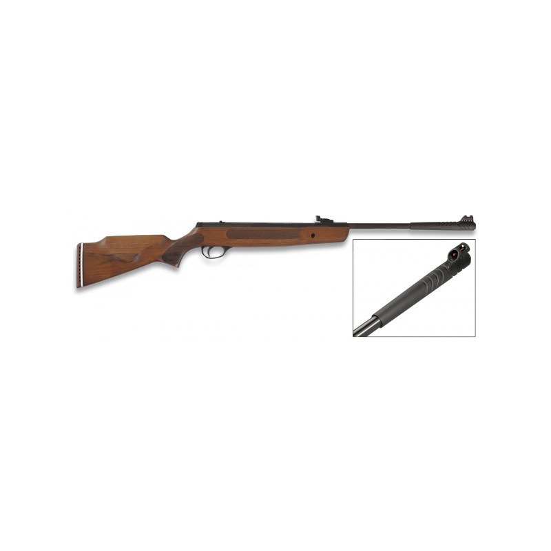 Large muzzle break for easy cocking with integrated hooded front sight with Truglo fiber optics