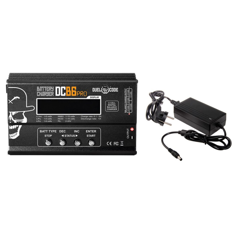 DUEL CODE B6 PRO CHARGER BALANCER WITH POWER TRANSFORMER<br /><br />Smart multifunction charger balancer:<br /><br />Operating voltage range: DC 11-18v<br />Outpu power: Max charge power 50W / Max discharge power 5W<br />Charge current range: 0,1-5,0A<br />Discharge current charge: 0,1-1,0A<br />Balancing current: 300mAh/cell<br />NiCD/NiMH battery cell count: 1-15 cell<br />Li-on/Fe/Polymer cell count: 1-6 cell<br />Pb battery voltage: 2V-20V<br />Net Weight: 575g<br />Power transformer 110-240v.