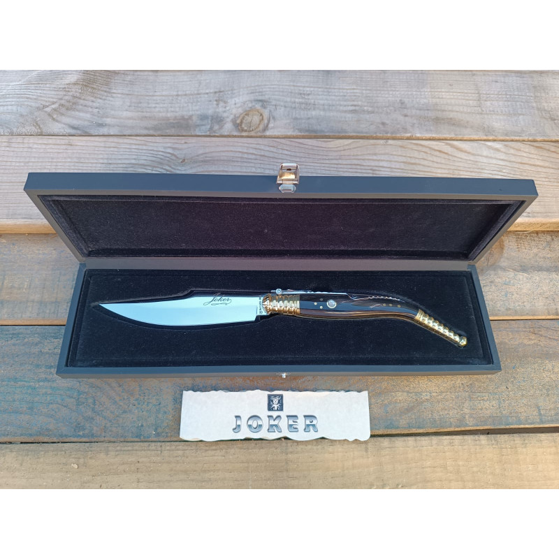 <p style="text-align:justify;">La Joyita de Joker handmade penknife with numbered series. It has a blade size of 13.5 cm made of Mova 1.4116 steel, with satin finish and clip point. The handle material is buffalo horn with mother of pearl mosaic inlay and brass ferrule, with a length of 16,5 cm. The total size of the Joker knife is 30 cm. This handmade knife is ideal as a collector's item or as a gift.</p>