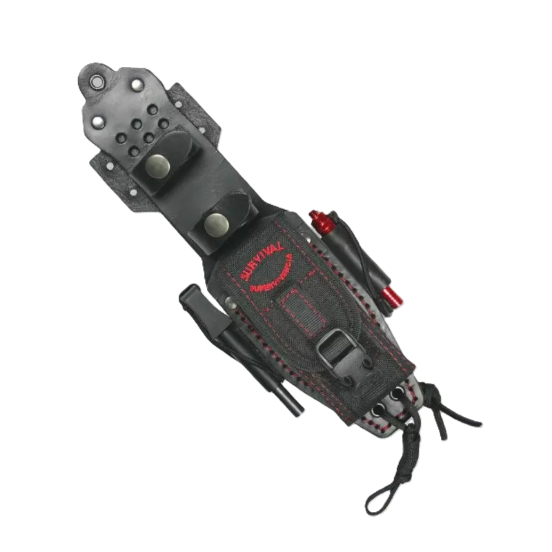 El cuchillo tiene una zona diseñada para hacer uso del pedernal, agujero iniciador para hacer fuego por fricción con arco, agujero para cordón, rompe-cristales (almenado), lomo redondeado para golpear sin dañar el palo y las cachas son desmontables (opción a repuesto) .