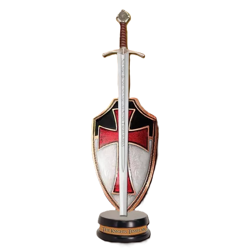 Magnífico y épico abrecartas de espada en miniatura asociado a una de las Órdenes militares más conocidas de todos los tiempos, Los Caballeros Templarios.<br /> El atril incluye un escudo esmaltado adornado con el escudo de armas de los templarios por ambos lados, lo que permite que la pieza pueda ser expuesta por una u otra cara.<br /> Todo fabricado en metal sobre la base de madera.<br />