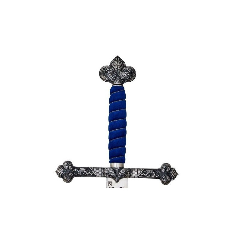 <p>- Espada de San Jorge, la legendaria espada que utilizo junto a la lanza San Jorge para matar al dragón.<br />- Fábricada en Acero inoxidable, la hoja tienen una grabado profundo, aproximadamente hasta la mitad de la hoja.<br />- La empuñadura es de terciopelo azul, y la cruceta tiene unos grabados del dragón en posición tumbado.<br />- Longitud total de la espada 120 cm.<br />- Acabado en Plata.</p>