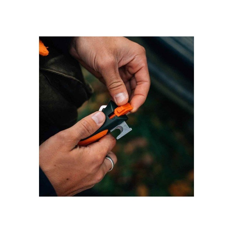 Herramienta de corte ideal para cuerdas y cinturones de seguridad en un extremo y de un orificio para cordón fiador de gran tamaño.