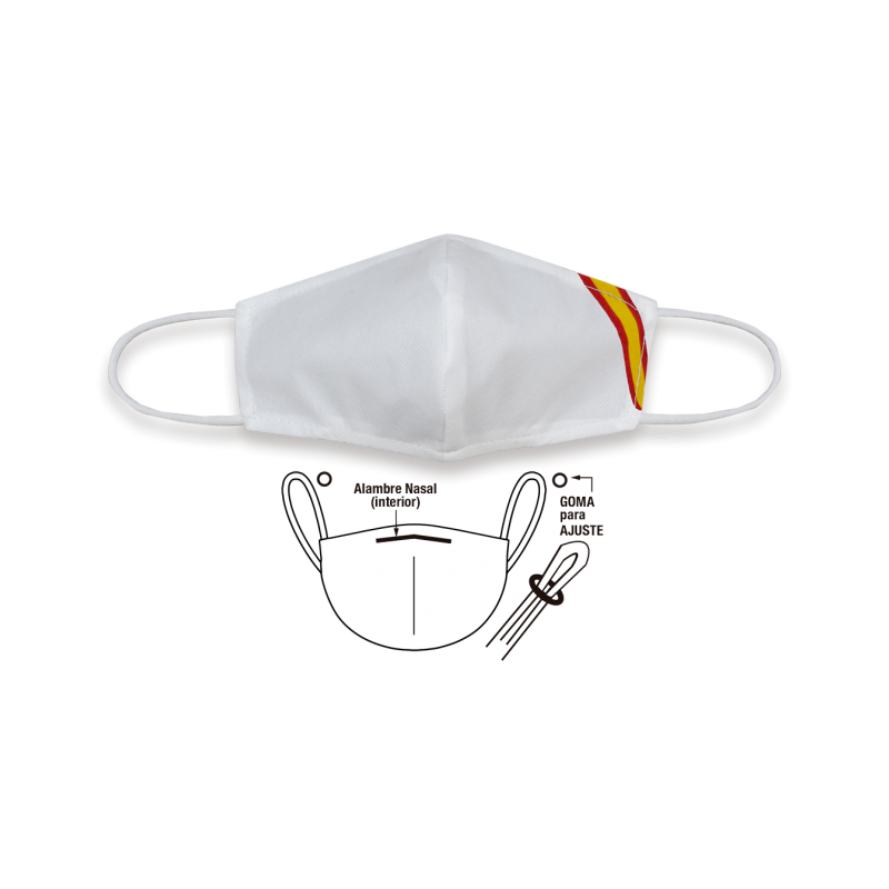 Accesorio facial<br />NO HOMOLOGADA<br />Material: TNT<br />Reutilizable<br />Color: Blanco<br />Modelo: Bandera España<br />Caracteristicas:<br />- Goma para ajuste<br />- Alambre Nasal<br />Hecho en España<br />ADVERTENCIA: Al no ser producto sanitario, no cumple con la Directiva 93/42 o el Reglamento UE/2017/745, ni está considerado como EPI