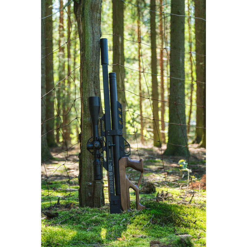 El rifle Argus 60 W PCP está equipado con un tanque de aire a alta presión de 300 Bar (4351 Psi) y tiene una capacidad de aire de 350 cc