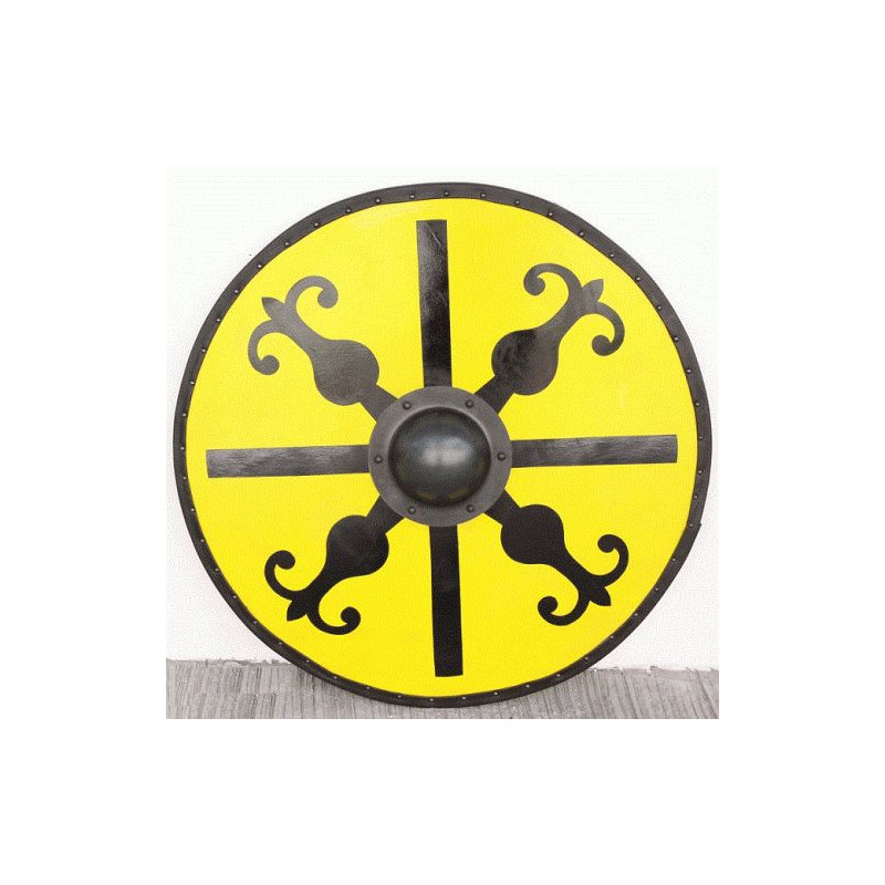 Escudo Medieval de madera. Cromado en amarillo y negro.<br />Diámetro: 76 cm x 76 cm.<br />Material: Madera y umbo de Acero.<br />Peso: 6 Kg.<br />Fabricado por Windlass Steelcrafts®.