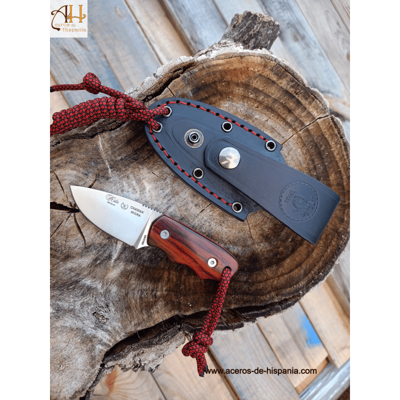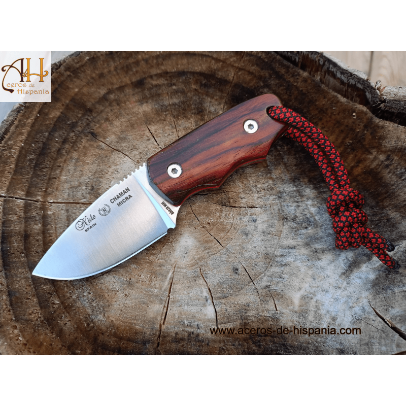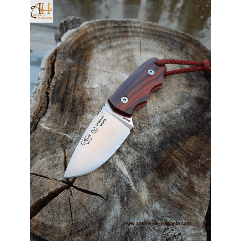 Cuchillo de cuello Nieto, el modelo Chamán Micra Böhler, es pequeño y ligero, tiene una longitud de hoja de 6 cm de acero Böhler N-695. Las cachas son de madera natural de cocobolo, tiene una longitud de 12 cm y su peso de 85 gramos. Los cuchillos son enterizos. Los puedes llevar donde quieras. Estos cuchillos son versátiles, son una variante de los cuchillos tácticos de supervivencia.