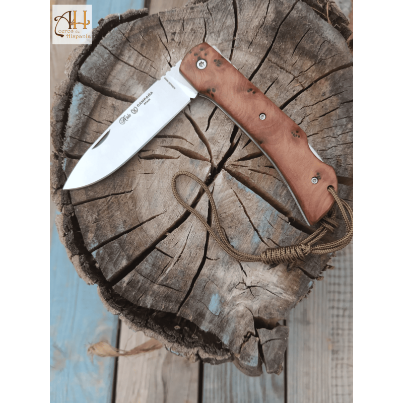 Su mango está elaborado en madera natural de tuya, lo que le aporta un carácter único con vetas y tonos cálidos que varían ligeramente en cada pieza. Con una longitud total de 20 cm y un peso de 100 gramos, esta navaja de campo resulta cómoda en mano y equilibrada en uso. Dispone de un sistema de bloqueo que garantiza un cierre seguro durante su manipulación, ideal para actividades en la naturaleza, camping o labores agrícolas.