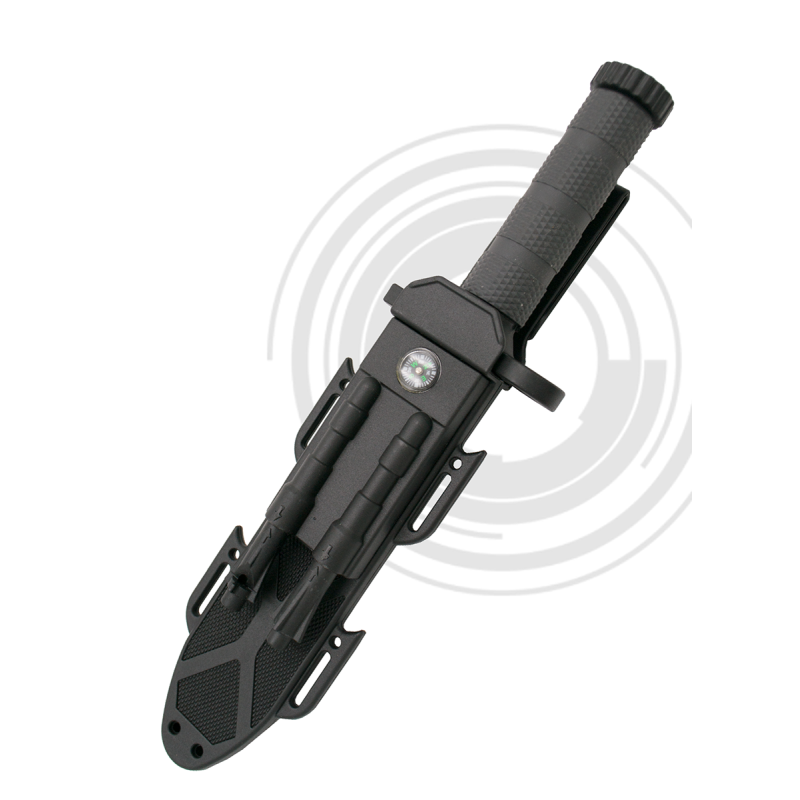 Cuchillo de supervivencia Third 11113BK con hoja de acero 420 de 19 cm, mango de fibra acabado en negro, funda de fibra con brújula, afilador y pedernal con silbido.