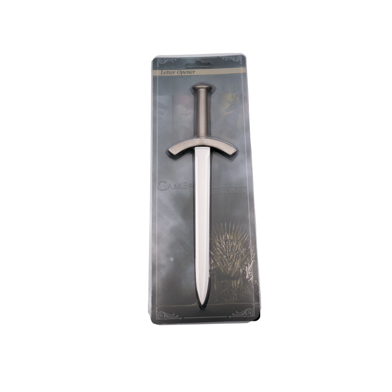 Abrecartas 10053-21 Robb Stark replica no oficial, el pomo, la guarda y la empuñadura son de color niquel . El tamaño total es de 22cm de hoja en acero, presentado con blister Ref. 10053-21