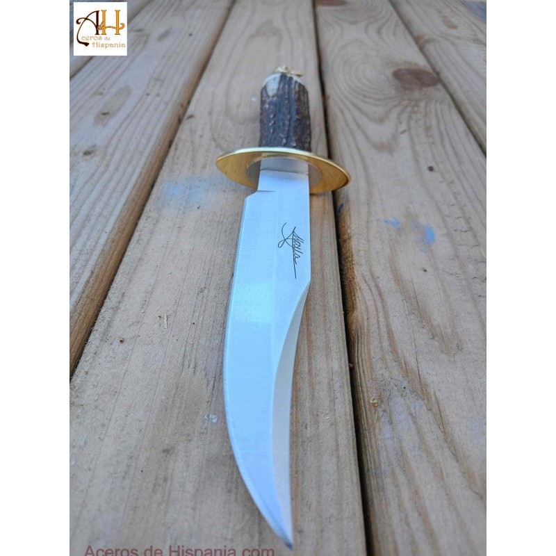 <p style="text-align:justify;"><span style="color:#000000;">Su empuñadura de <strong>asta de ciervo auténtica</strong> proporciona un agarre cómodo y seguro, mientras que la <strong>doble guarda de latón</strong> protege la mano en cada uso. El detalle más distintivo es su <strong>pomo con forma de cabeza de jabalí en latón</strong>, símbolo de la caza mayor.</span></p>