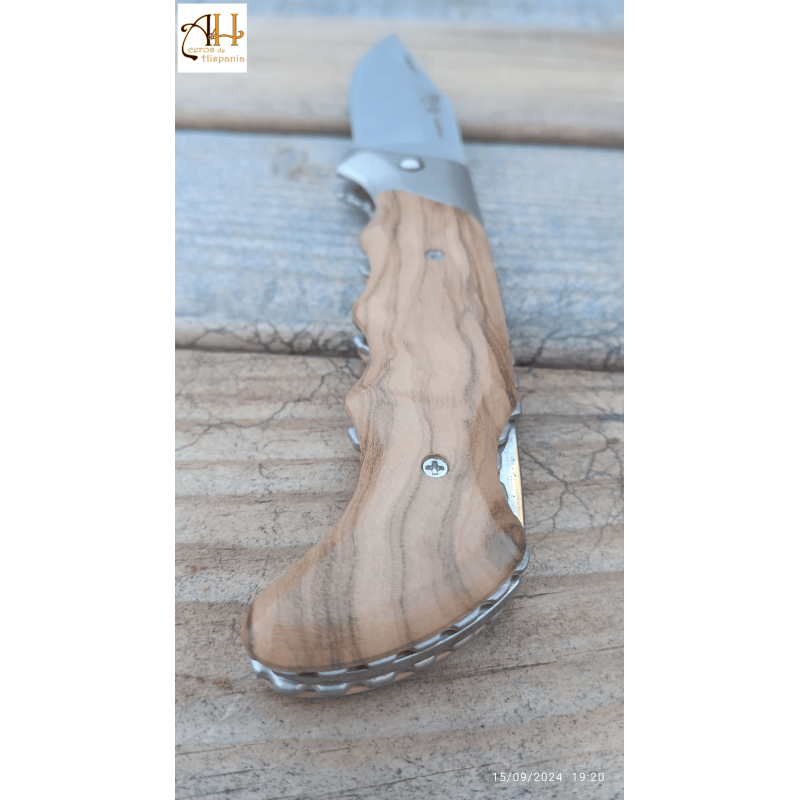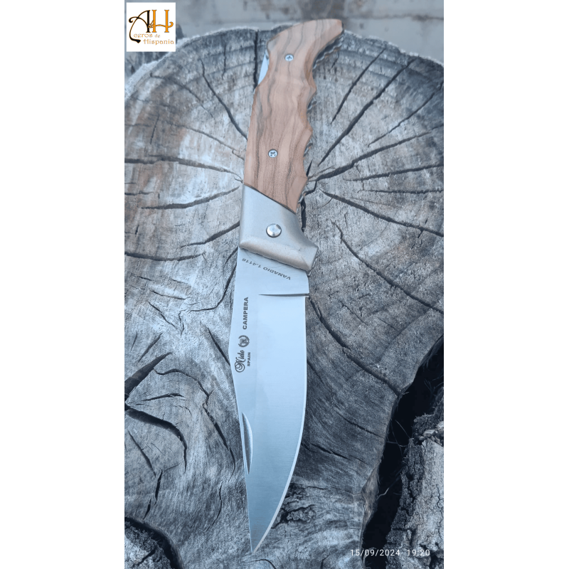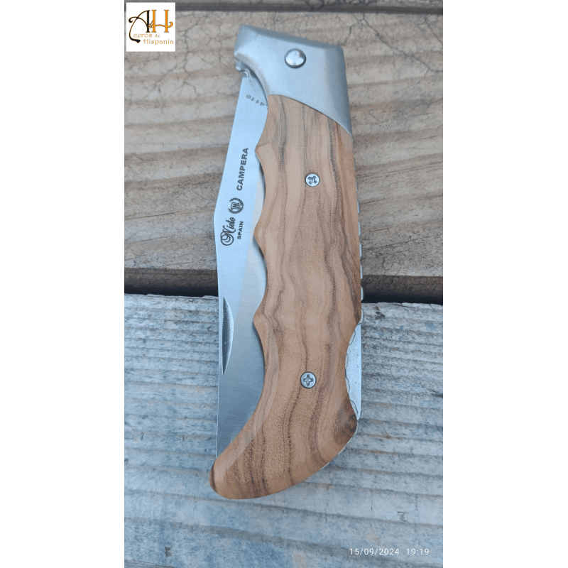 Navaja Campera Nieto para el campo y caza. Tiene una hoja de 9,50 cm de acero AN-58, con un sistema de cierre de bloqueo. El mango es de cromo duro y madera de olivo. El tamaño total de la navaja es de 21 cm, es una navaja muy ligera con un peso de 147 gramos.  Es una navaja fabricada en España.