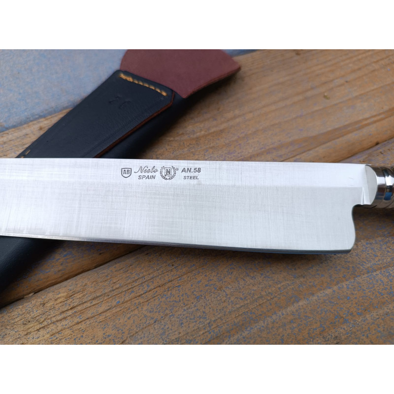 <p style="text-align:justify;">Con una hoja de acero AN58 C de alta calidad, el cuchillo Nieto Gaucho G-26 ofrece una excelente durabilidad y resistencia. Su hoja afilada de 26 cm y 4 mm de espesor, permite cortar fácilmente todo tipo de carnes, desde jugosos cortes de carne de res hasta tiernos trozos de pollo. Además, su diseño ergonómico y mango de madera de stamina, proporcionan un agarre cómodo y seguro, lo que facilita su uso durante largas sesiones de asado.</p>