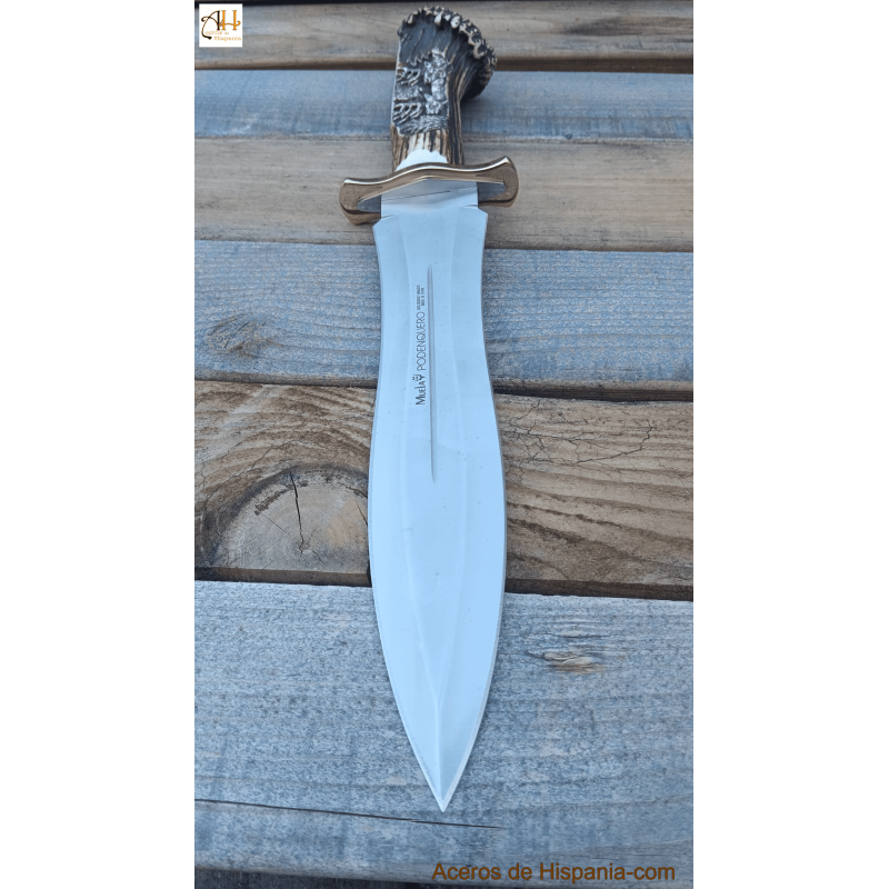 <p style="text-align:justify;"><span style="color:#000000;">El cuchillo <strong>Muela Podenquero GV</strong> cuenta con un mango de asta de ciervo tallado con una escena de ciervos, que le da un toque único y distintivo. Además, su defensa de latón e inoxidable garantizan su durabilidad y resistencia. Con un mango de aproximadamente 140MM (5 1/2') y una hoja de 260MM (9 3/4'), este cuchillo es ideal para tareas de acabado en la caza. Con un peso de 650 gramos, es ligero y fácil de manejar.</span></p>