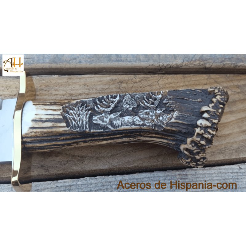 Cuchillo con puño de asta de ciervo tallado (escena de ciervo) con roseta y defensa de latón e inoxidable.