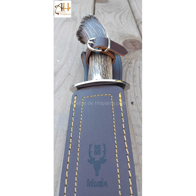 <p style="text-align:justify;"><span style="color:#000000;"><strong>Marca</strong>: Muela</span><br /><span style="color:#000000;"><strong>Modelo</strong>: Sarrio 19S</span><br /><span style="color:#000000;"><strong>Tipo de hoja</strong>: Normal recta</span><br /><span style="color:#000000;"><strong>Material de la hoja</strong>: Acero MOVA (1.4116)</span><br /><span style="color:#000000;"><strong>Dureza</strong>: 56-58 HRC</span><br /><span style="color:#000000;"><strong>Longitud de la hoja</strong>: 195 mm</span><br /><span style="color:#000000;"><strong>Grosor de la hoja</strong>: 4,5 mm</span><br /><span style="color:#000000;"><strong>Longitud del mango</strong>: 135 mm</span><br /><span style="color:#000000;"><strong>Material del mango</strong>: Asta de ciervo con roseta y cruceta inoxidable</span><br /><span style="color:#000000;"><strong>Longitud total</strong>: 330 mm</span><br /><span style="color:#000000;"><strong>Peso</strong>: 300 g</span><br /><span style="color:#000000;"><strong>Guarda</strong>:<strong> Inoxidable</strong></span><br /><span style="color:#000000;"><strong>Funda</strong>:<strong> Cuero de alta calidad</strong></span><br /><span style="color:#000000;"><strong>Fabricación</strong>: Cuchillo Artesanal en España</span></p>