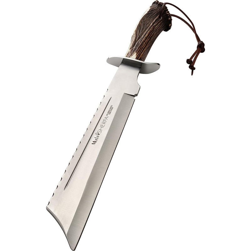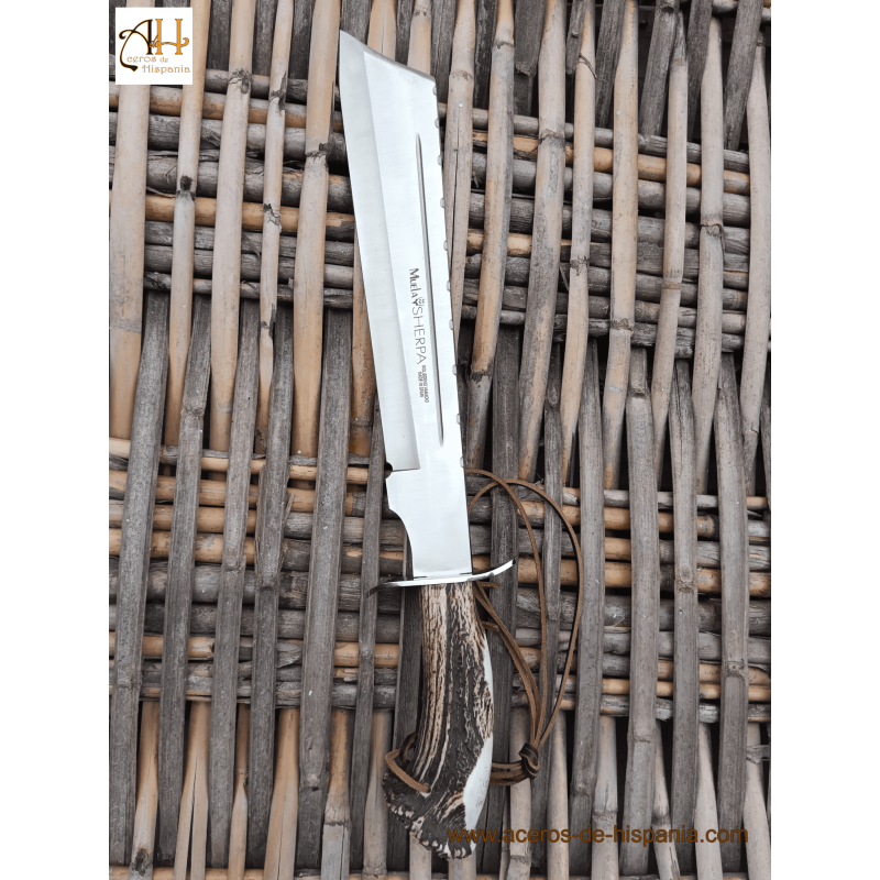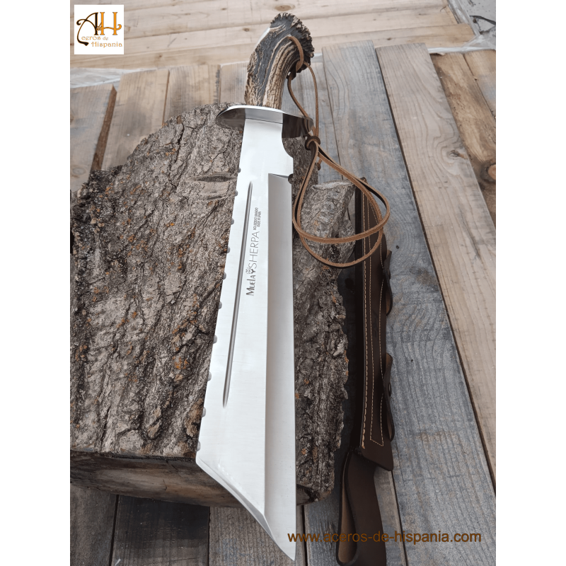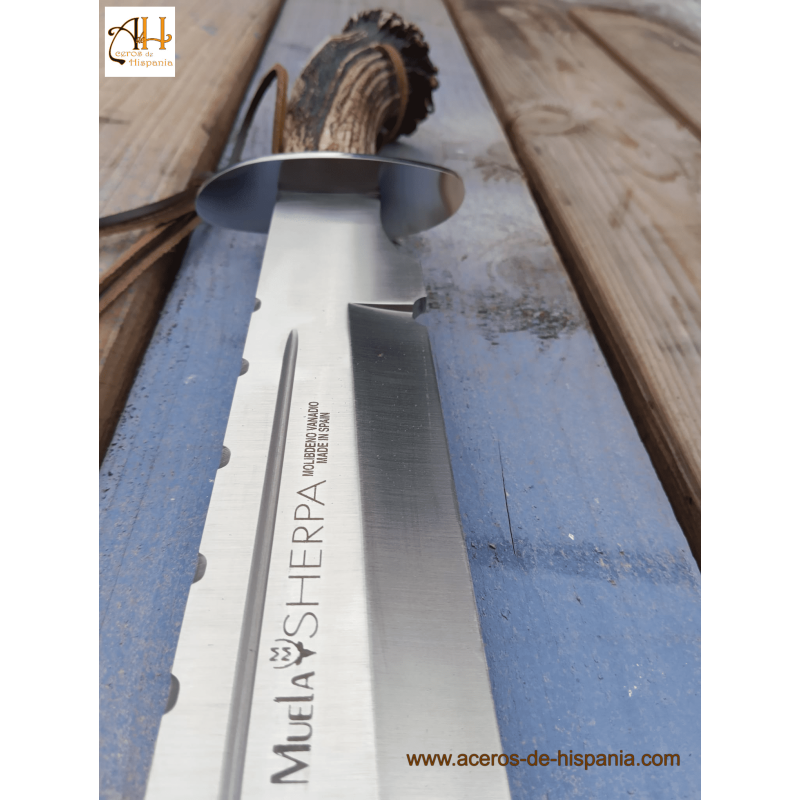 El machete Muela Sherpa 28S, tiene una hoja de 33 cm de acero Molibdeno Vanadio, el mango tiene una longitud de 16 cm y es de asta de ciervo acabado en roseta. La defensa es de acero inoxidable. Tiene un peso de 850 gramos. Esta macheta modelo Sherpa está fabricada en España.