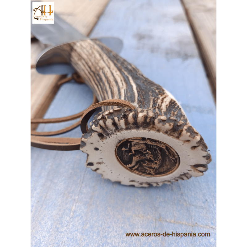 - Macheta con mango de asta de ciervo y rosetón con defensa de acero inoxidable.