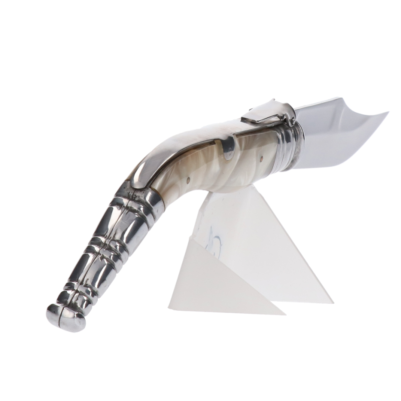 Las cachas de esta navaja son imitación nácar de color blanco, lo que le da un aspecto muy llamativo y atractivo. El tamaño del mango es de 15 cm, lo que proporciona un agarre cómodo y seguro. Con una longitud total de la navaja de 26 cm.