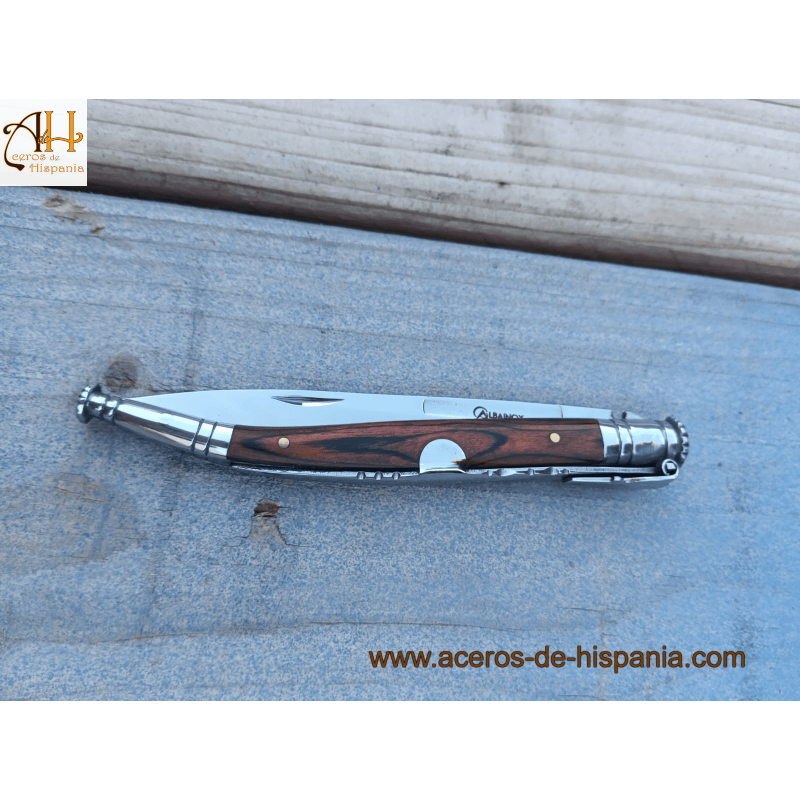 Navajas estilete. Esta navaja de estilete de Albainox, tiene una hoja de 9,80 cm de acero 3Cr13Mov acabado espejo y con un grosor de 1,60 mm. Tiene un mango de 13 centímetros, acabado en estamina roja. La longitud total de la navaja es de 22,80 cm.