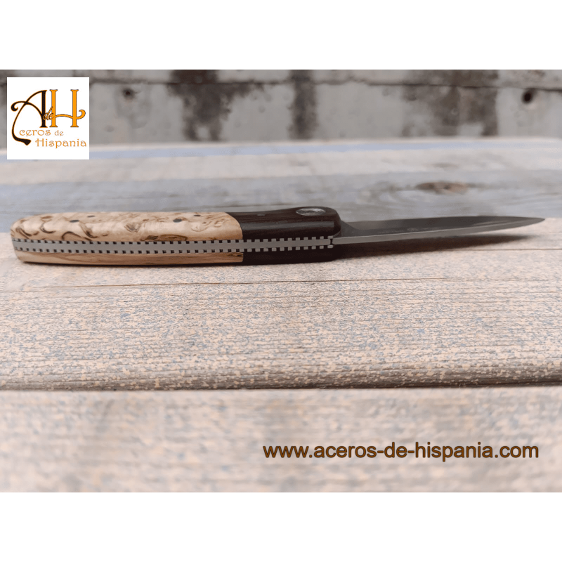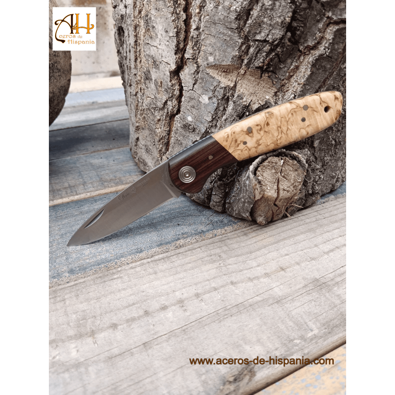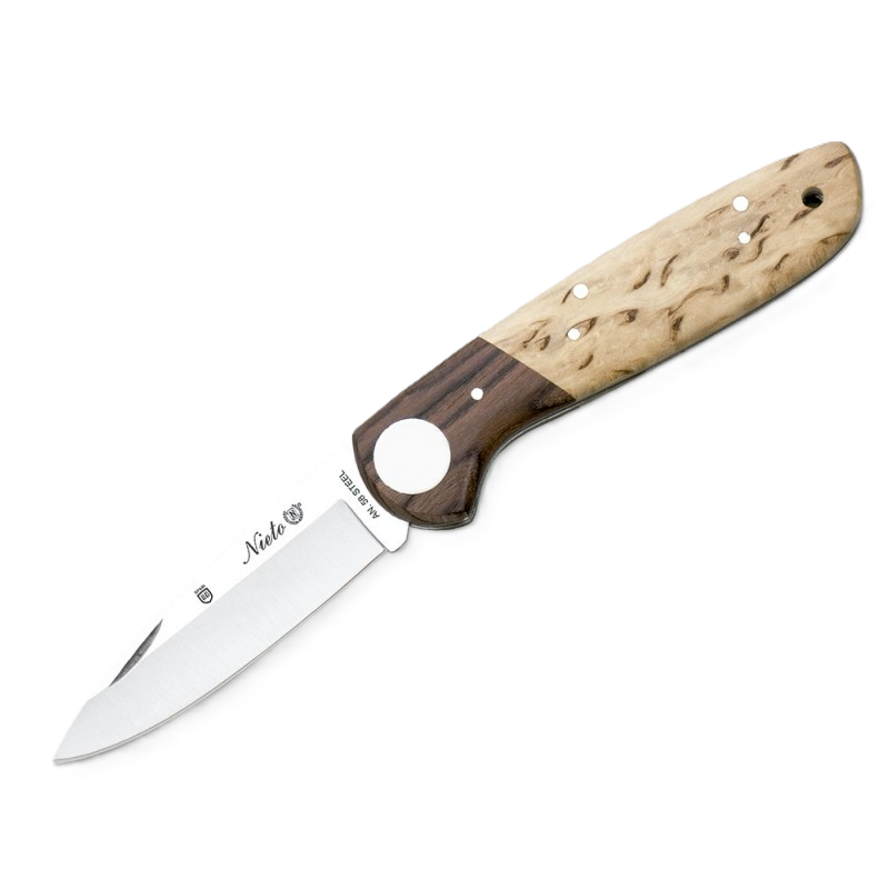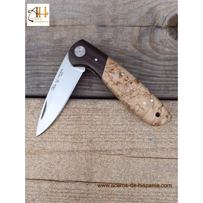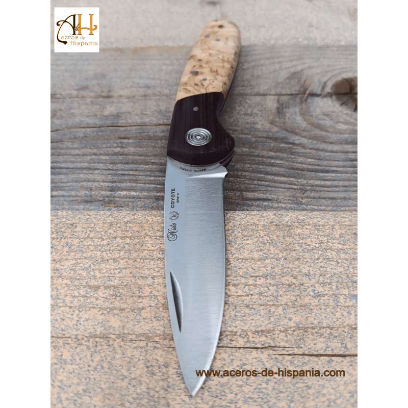 Navaja Nieto de bolsillo Coyote, tiene las cachas fabricadas en madera natural de abedul rizado. La virola es de madera natural de palo de violeta. Tiene una longitud total de 18 cm. Tiene un sistema de cierre de bloqueo, el remache es de acero inoxidable 303. Es muy ligera pesa 80 gramos.