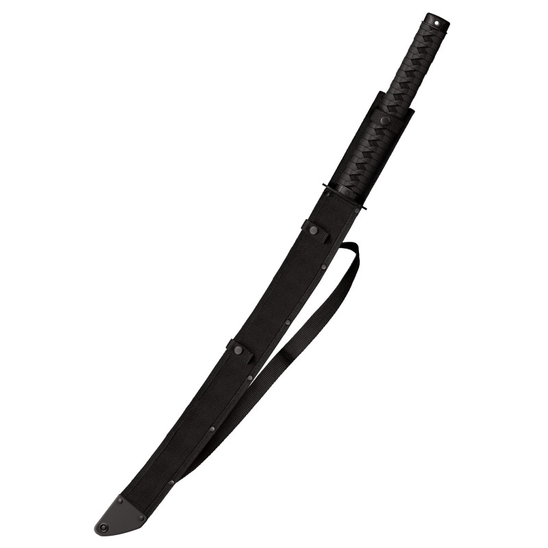 Machete katana táctico con funda, Cold Steel. Con una longitud total aproximada de 92,1 centímetros, con hoja de 61 cm con acabado mate en negro y antioxidante, con acero de alto carbono 1055.