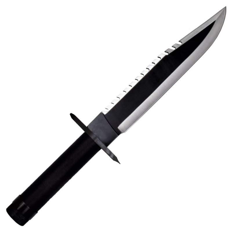 Cuchillos de Rambo, el Rambo I tiene una hoja de acero de 22,5 cm, el mango es de metal revestido de cordura. El cuchillo tiene una longitud total de 36 cm. Incluye un mini kit de supervivencia en el interior del mango. La vaina es de polipiel con pasador para cinturón.