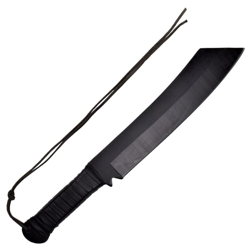 Cuchillos Rambo, este Rambo IV tiene una hoja de acero anodizado en color negro con una longitud de 29 cm. El mango es de acero forrado en cuero negro. La longitud total del cuchillo es de 42,8 cm. Tiene un peso de 760 gramos aproximadamente.