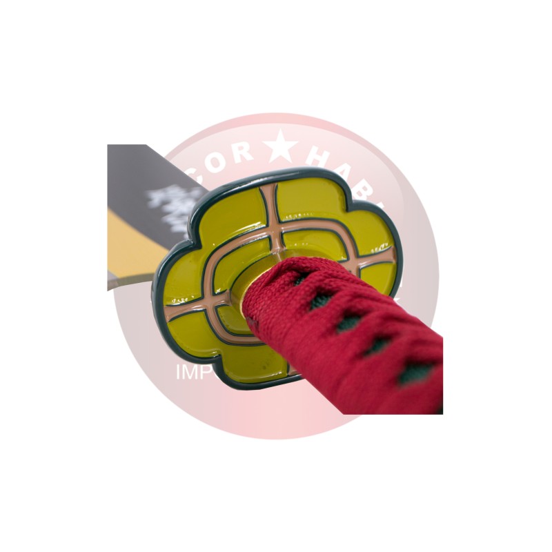 Espadas gemelas S0273 de Demon Slayer empuñadas por Tengen Uzui mango encordado en color granate y hoja negra con corte en satinado y amarillo.
