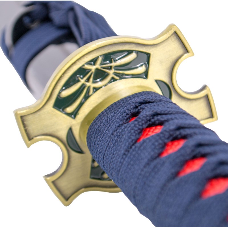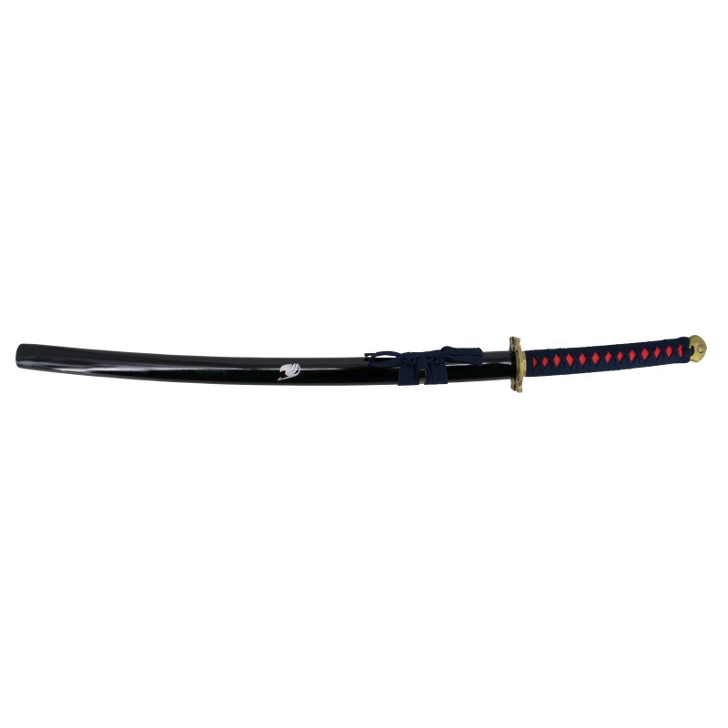 <p>Katana de Erza Scarlett de Fairy Tail réplica no oficial de 103 cm hoja de acero negra con corte en satinado, vaina negra lacada con detalle en plateado, mango encordado azul marino e imitación de piel de raya en rojo. </p>