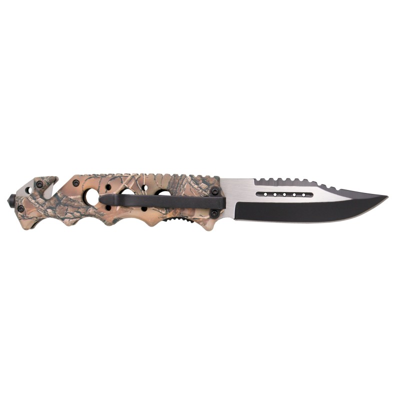 <p>Navaja Third N88C mango de aluminio con recubrimiento camo de bosque otoñal, agujeros en el mango y calavera. Hoja de 9 cm satinada con patrón rasgado horizontal, corte y detalles en negro. Con clip. </p>