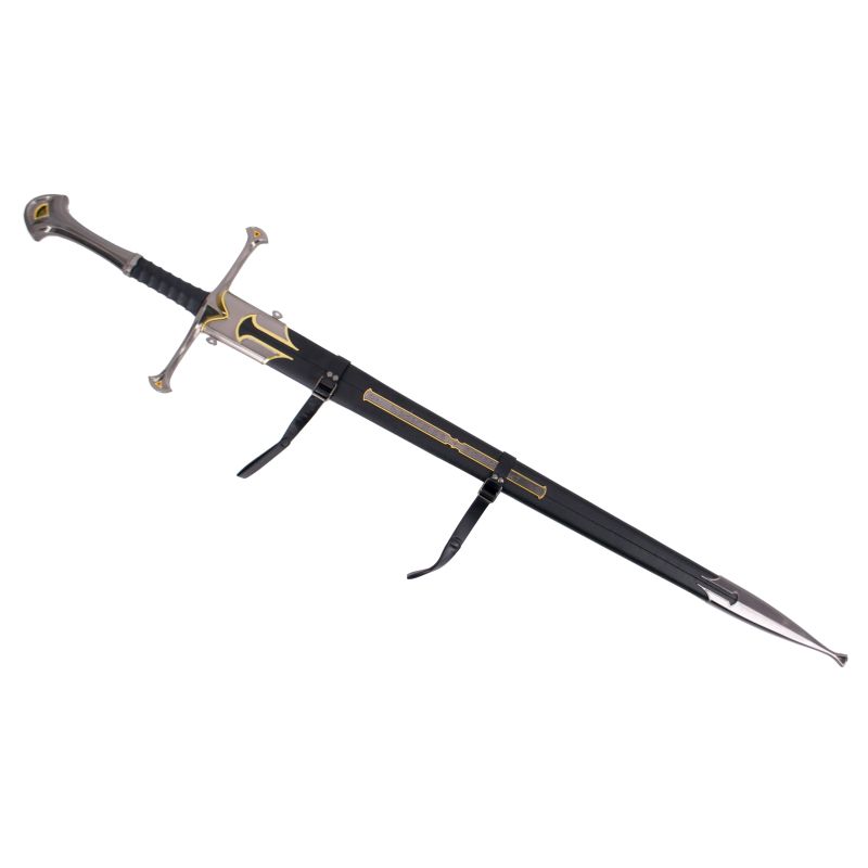 Espada S0345 Modelo de Andúril, replica No oficial, con un tamaño total de 120 cm, hoja de acero con las runas, mango acabado en níquel y dorado con una vaina acabada en polipiel negra con las partes metálicas en níquel y dorado, con una placa con runas en la parte del cosido de la vaina. Con soporte decorado.