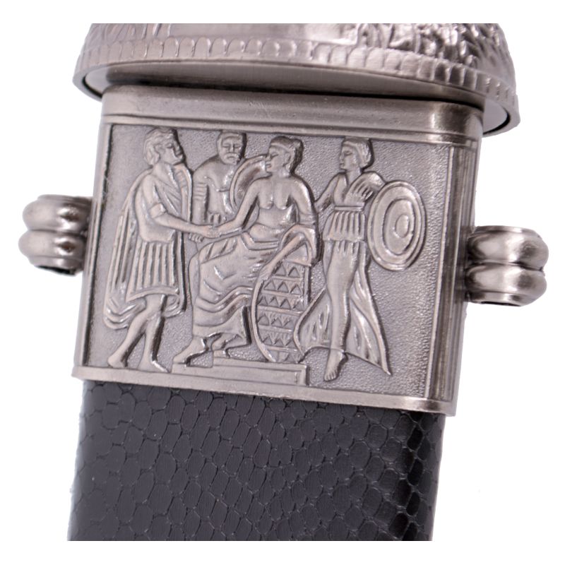 Espada Gladius acabada en níquel y vaina en negro, con un tamaño total de 100 cm con hoja de acero.