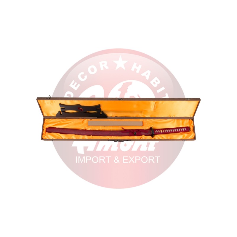 Katana Funcional S6040 de 104 cm hoja de acero de damasco rojo, vaina de madera forrada de polipiel roja con detalles de flores de lotus, mango encordado rojo con piel de raya auténtica. Con soporte.