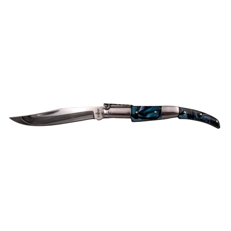 Navaja de carraca de Third Serie Zafiro N53A, realizadas con tecnología CNC, mango con virolas de acero inoxidable acabadas en brillo espejo e inserciones de acrílico azul, hoja de acero 440 acabada en brillo espejo de 11 cm, con el muelle y la palanquilla decorada. Con caja de presentación.