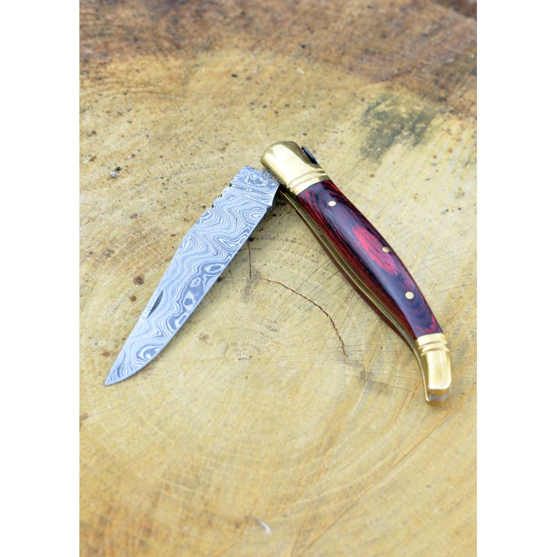 Navaja estilo Laguiole con hoja forjada en acero de Damasco (176 capas) y empuñadura de madera.