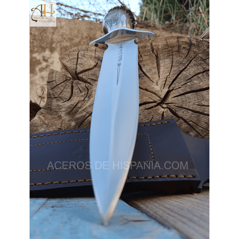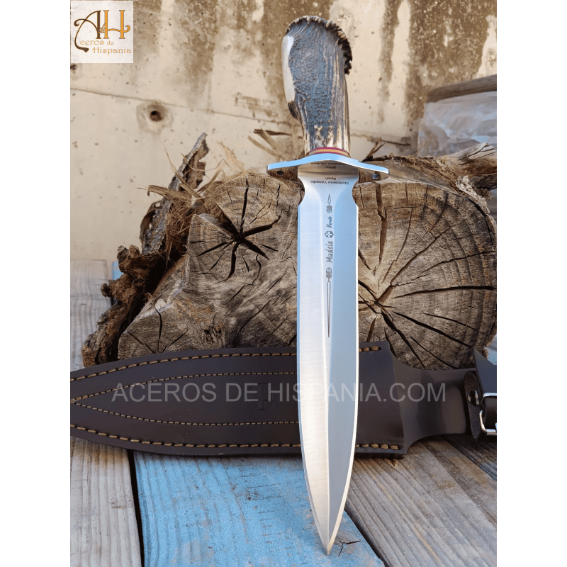 El cuchillo de remate Mudela VARETO-23 destaca por su diseño robusto y su elegante mango de asta de ciervo con roseta y bandera. Equipado con hoja de acero inoxidable MoVa 380, está pensado para la caza mayor en montería. Su tamaño y equilibrio lo hacen eficaz y manejable. Incluye funda de cuero de gran resistencia.