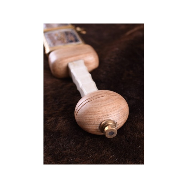 - Material: hoja de acero para muelles EN45 (acero al carbono, no inoxidable), empuñadura de hueso, guarda y pomo de madera, tuerca de sujeción e incrustación de la guarda de latón