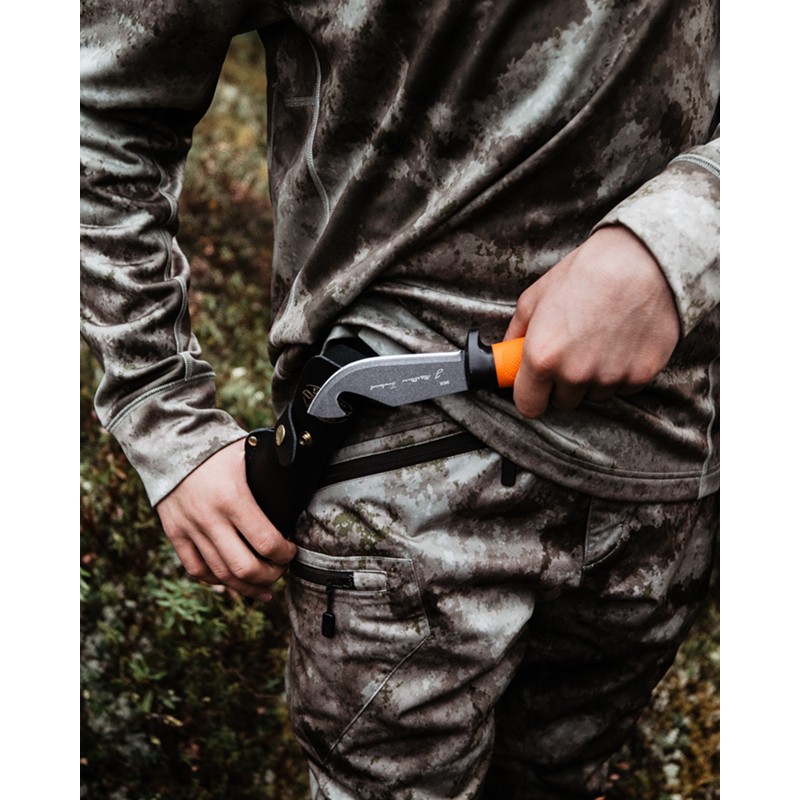 El mango de goma naranja y el protector de dedos garantizan un agarre cómodo y seguro, haciendo de él una herramienta multiusos para cazadores.