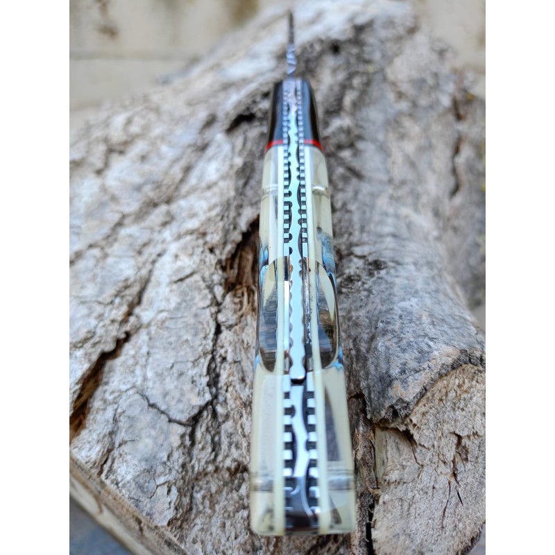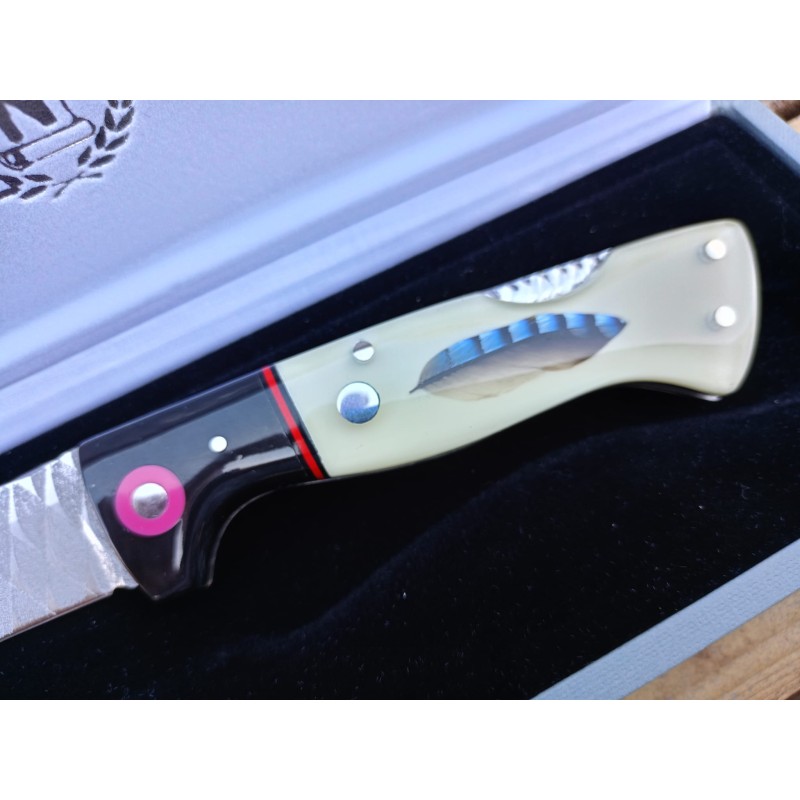 <p>- Hoja de acero AN-58<br />- Mango de resina de hueso y metacrilato con inserción de pluma natural<br />- Virola: katex<br />- Incluye estuche de presentación con certificado<br />- Longitud hoja: 8 cm<br />- Longitud total: 18.5 cm<br />- Peso: 108 gramos</p>