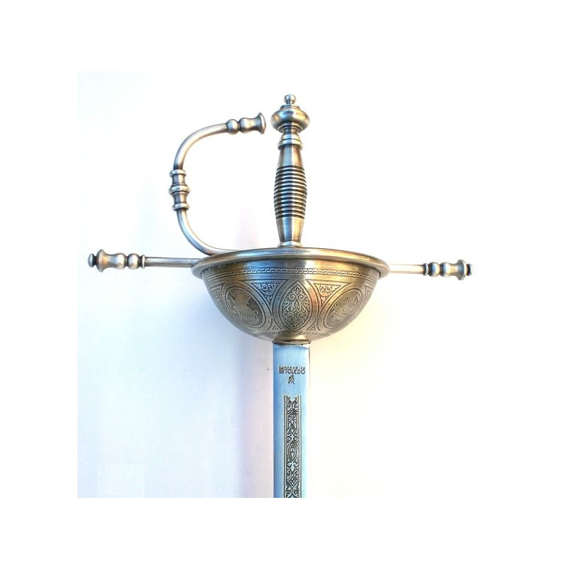 Cazoleta Española en plata envejecida,Hoja en acero inoxidable.<br /><br />Longitud 104 cms, peso 1350 gramos.