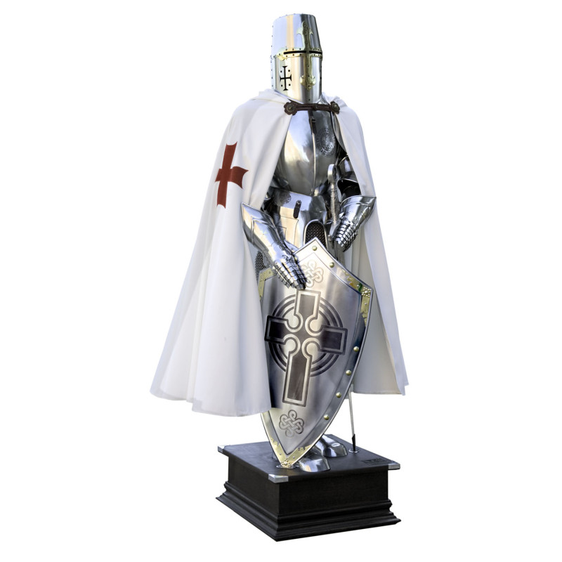 El color blanco era utilizado en la época medieval, por los caballeros templarios de la orden del temple, en escudos, banderas y estandartes, simbolizando su vocación religiosa. El color rojo se utilizaba para el color de la cruz de anchos brazos, bordada en sus escudos, banderas y en el centro del pecho. Cruz bermeja, otorgada por el Papa Eugenio III para que fuese su signo contra la lucha al infiel. - Armadura medieval Templaria que simula la utilizadas en el Siglo XIII. - Armadura medieval Funcional y articulada. - Realizada en acero al Carbono Galvanizado. - Detalles y dibujo de la cruz Grabados al acido. - Altura 2 metros. - Peso 45 Kg. - Incluye Capa de Algodón con la Cruz Templaria Bordada en rojo y escudo con la cruz del temple. - También incluye soporte de madera.
