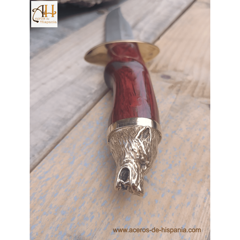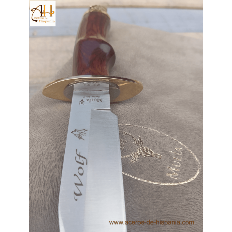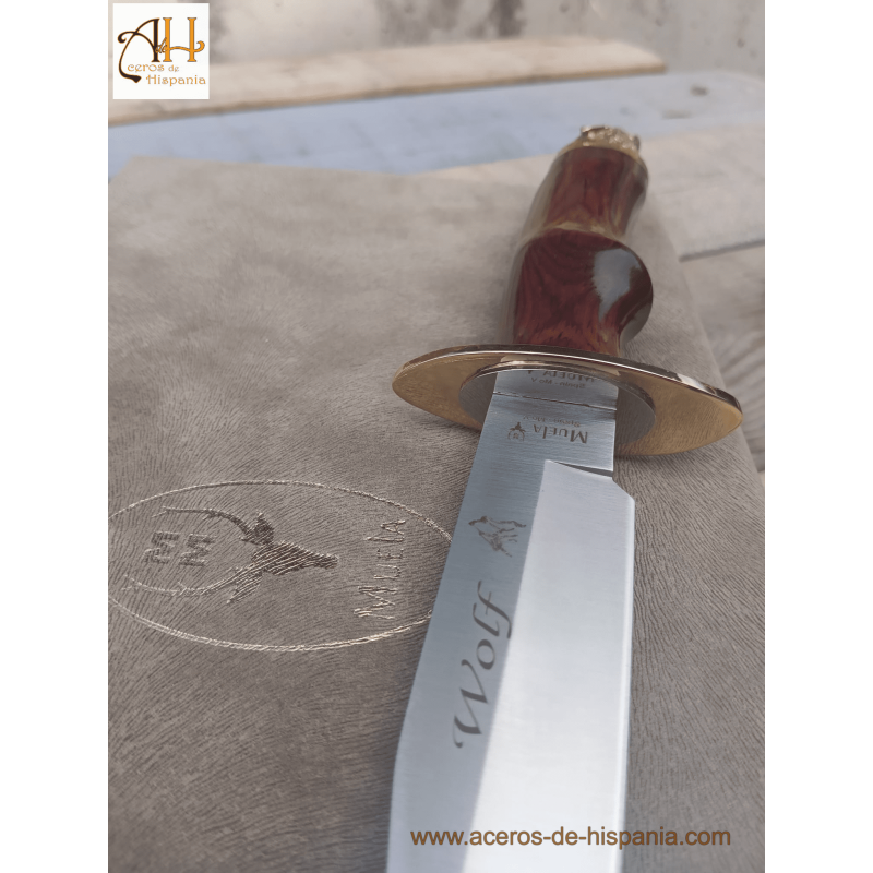 COUTEAU DE CHASSE MUELA WOLF-16R, d’une seule pièce, fabriqué en acier MOVA, manche en bois de palissandre, garde-boue en laiton et pommeau tête de loup. Comprend un étui en cuir marron.