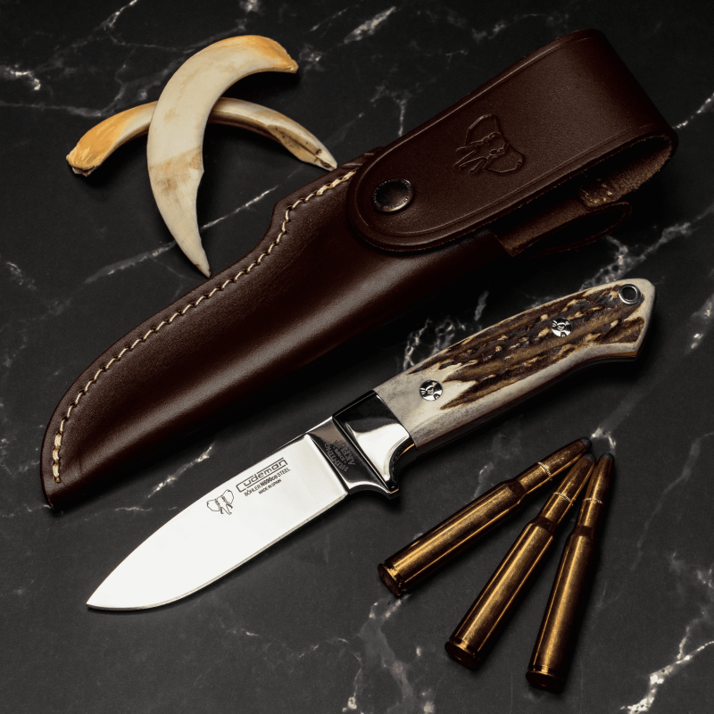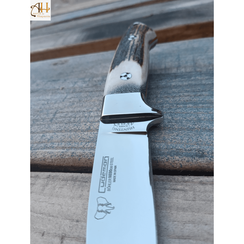 Il dispose d’une lame de 10 cm en acier N690CO BÖHLER d’une dureté de 60 HRc, avec une épaisseur de lame de 4 mm. Il a la pointe de la lame Drop-point et sa finition polie. Les poignées sont en cerf poli avec un séparateur rouge.