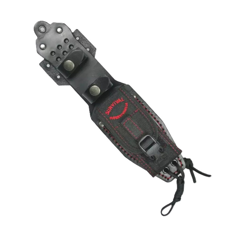 Le couteau a une zone conçue pour utiliser le silex, un trou d’initiateur pour faire un feu de friction avec un arc, un trou pour la corde, un brise-verre (crénelé), une colonne vertébrale arrondie pour frapper sans endommager le bâton et les écailles sont amovibles (option de rechange).