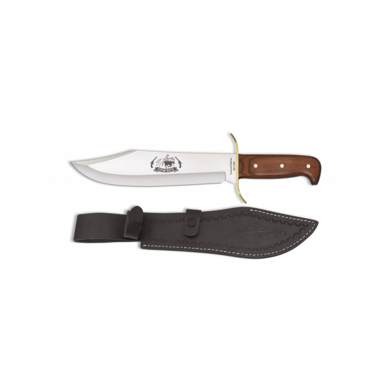 Édition limitée<br />Marque : Albainox<br />Modèle : Cowboy<br />Poignée : Bois<br />Lame : Acier inoxydable<br />Taille de la feuille : 25 cm (taille totale : 37,5 cm)<br />Épaisseur de la lame : 4,6 mm<br />Présentation : Housse en cuir