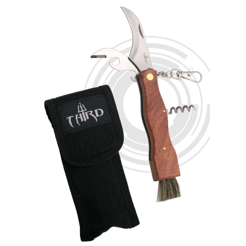 Troisième couteau à champignons K1279 avec manche en bois, lame en acier inoxydable de 7,8 cm, comprend un porte-clés, un tire-bouchon, un ouvre-bouteille et une brosse. Avec manchon en nylon. Réf. K1279