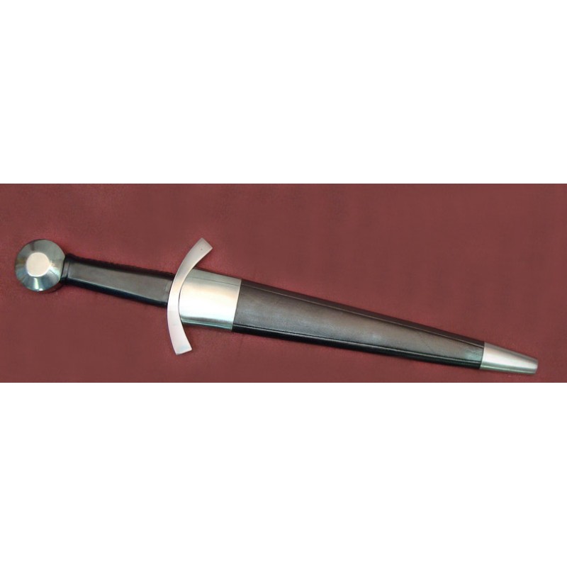 De grands poignards étaient portés par de grands chevaliers et des hommes d’armes.<br /> Bien qu’ils aient également été utilisés pour des tâches sur le terrain, leur utilisation principale était sur le champ de bataille où ils occupaient la dernière ligne de défense.<br /> Cette forme classique est dotée d’un bouton avec une bille d’acier et d’une protection incurvée basse.<br /> Le manche est en bois doublé de cuir et le large, qui maintient fermement la lame, est en acier au carbone trempé.<br /> Comprend un fourreau assorti.<br /> <br /><br /> - Longueur totale : 45 cm <br /><br /> - Lame : 30 cm de long, 4 cm de large, 0,47 cm d’épaisseur <br /><br /> - Poids : 570 gr <br /><br />Fabriqué par Windlass Steelcrafts®