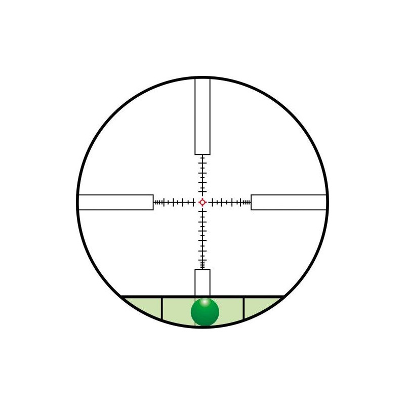 - Réticule MIL DOT modifié gravé d’un point central illuminé en bleu et rouge avec 5 intensités. Tourelle située à 45º.