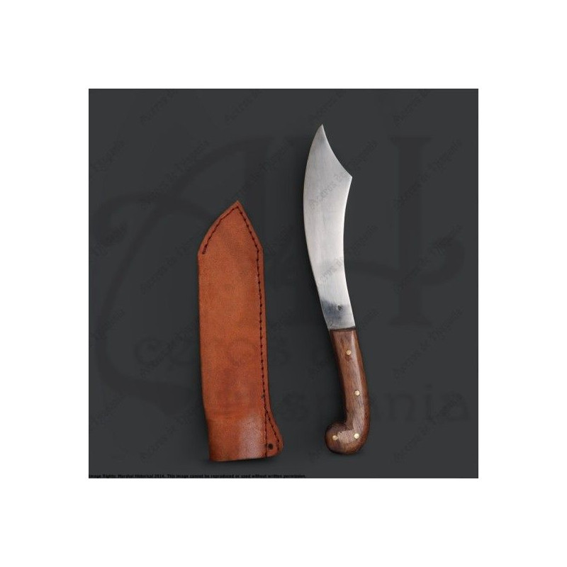 Comme on peut le voir dans des textes tels que les sermons de Saint Vincent Ferrier, les parents avaient l’habitude de donner un couteau à leurs enfants dès leur plus jeune âge. C’est un outil très utile pour les besoins de l’époque, car il peut être nécessaire d’avoir à couper quelque chose à la fois à table, à l’atelier, sur le terrain ou même face à un terrible malentendu ! Basé sur une illustration du Tractatus de Ludo Scacorum, ce modèle de lame large et incurvée est assez courant entre le milieu du XIVe et le XVe siècle. Compagnon idéal pour le paysan et le soldat. Le couteau est un instrument utilisé pour couper, il se compose d’une fine lame métallique avec un ou deux côtés tranchants et d’un manche par lequel il est tenu. Il est utilisé comme outil et comme arme depuis l’âge de pierre. Ce couteau forgé à la main a les dimensions suivantes : <p style="font-size:12.222222328186px;"> - Longueur totale : 23 cm.</p> <p style="font-size:12.222222328186px;"> - Longueur de la lame : 14,4 cm.</p> <p style="font-size:12.222222328186px;"> - Avec gaine incluse.</p>